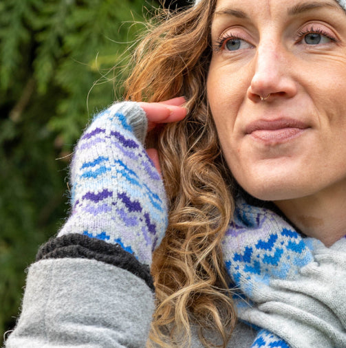 Stay cozy and stylish this winter with our Blue & Grey Heart Knitted Wrist Warmers. Made from a warm wool mix, these sustainable and recycled wrist warmers feature a charming heart design in grey and blue. Keep your hands warm and look fashionable with these must-have winter accessories.