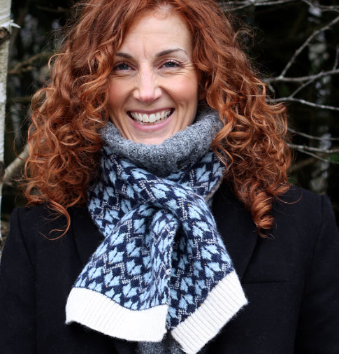 Navy and sky blue recycled blend Scandi flower knit scarf with pull through design and ecru ribbed knit at each end